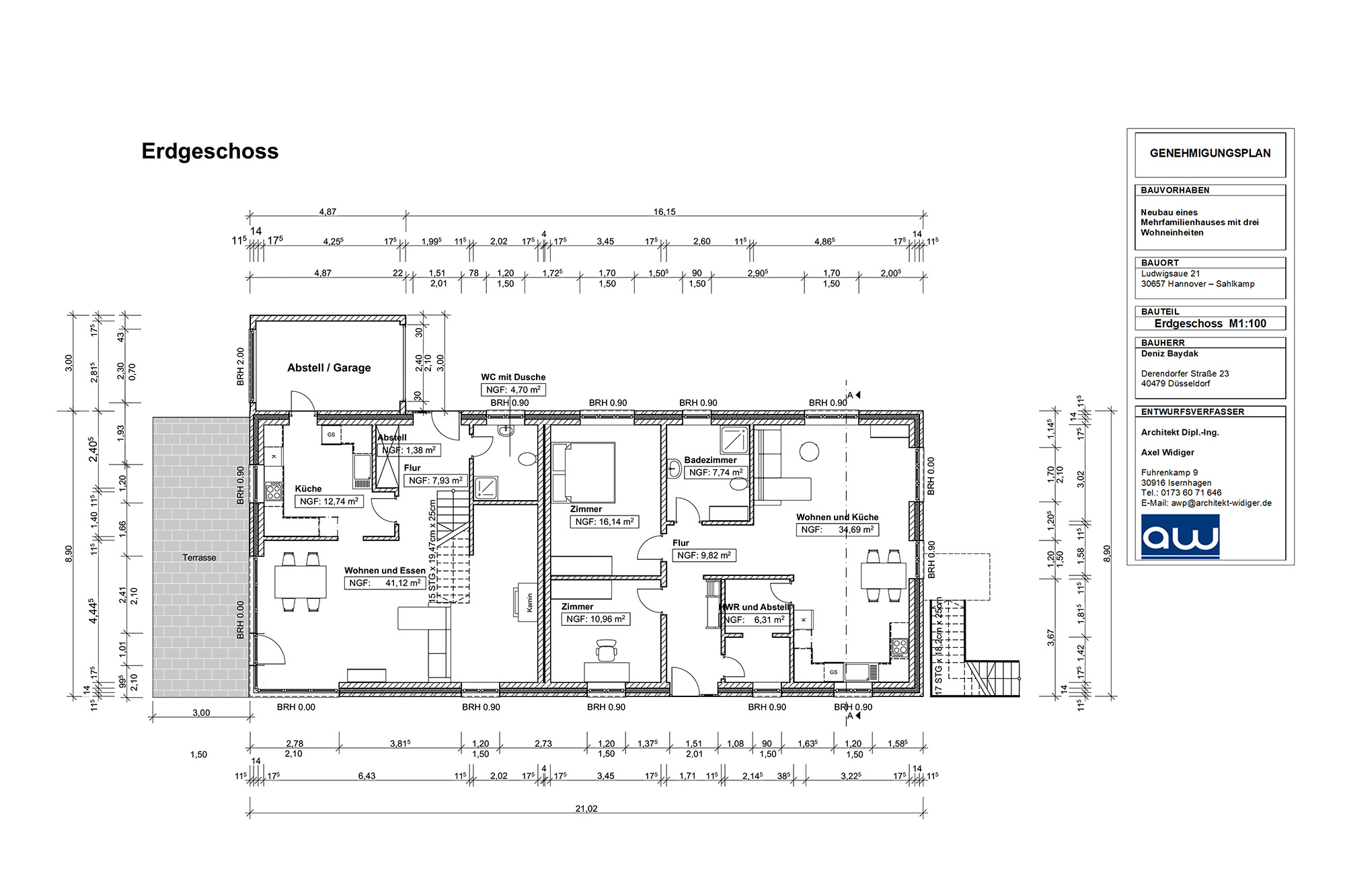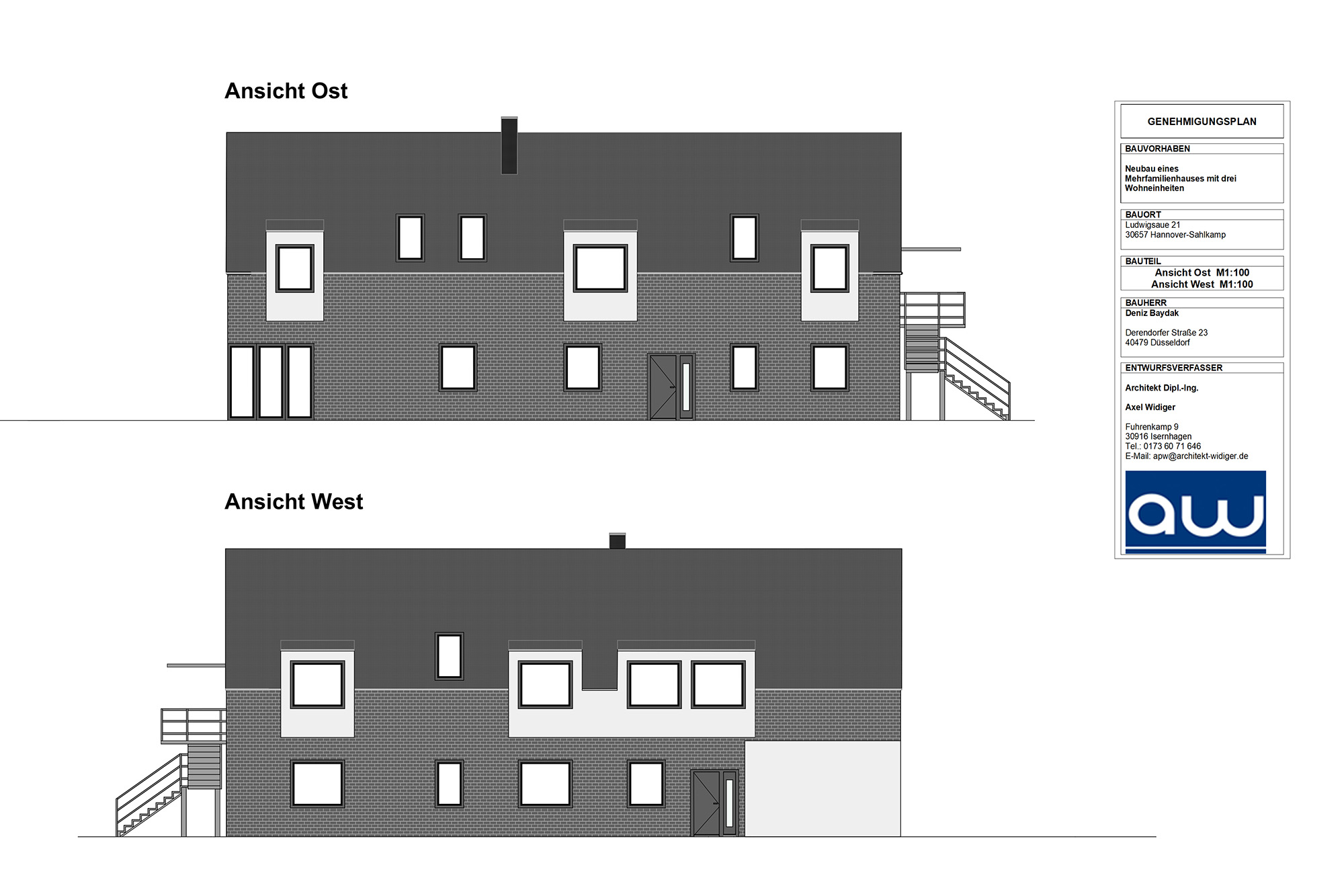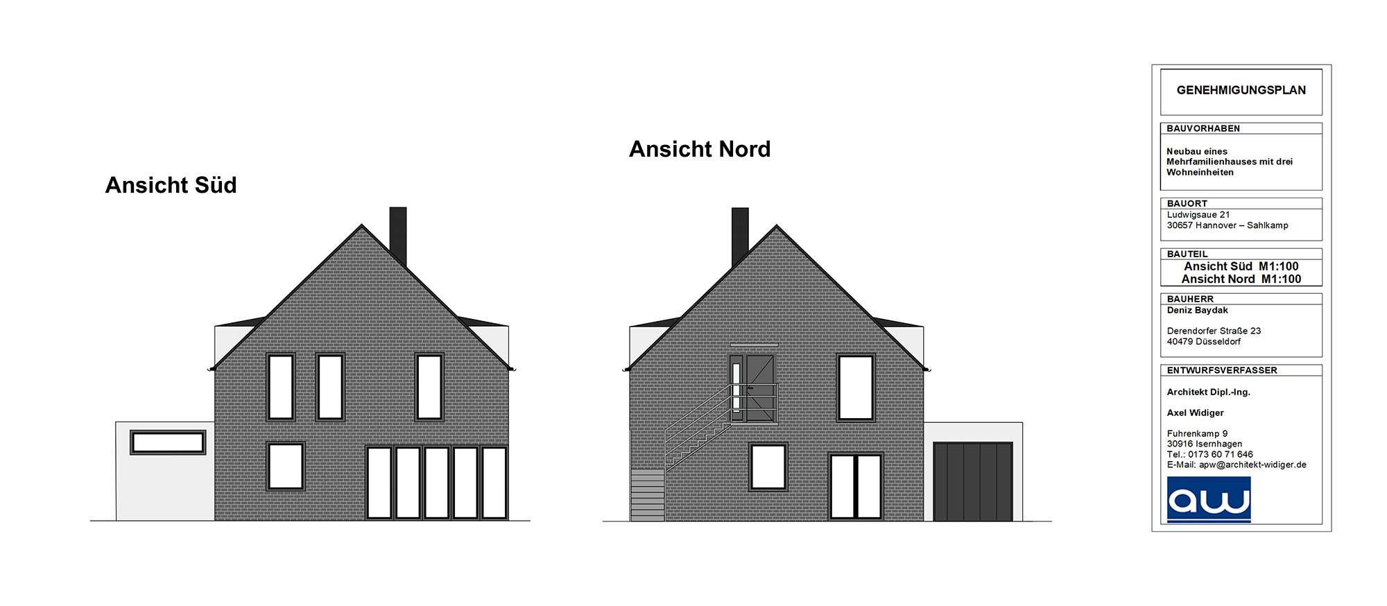 Im Norden der Stadt Hannover, im Stadtteil Sahlkamp, hatten sich Bauherren ein Grundstück gekauft mit der Zielsetzung, für sich Wohnraum zu schaffen und darüber hinaus zwei Wohneinheiten für Mietzwecke. Wir machten uns sogleich im Sommer 2023 an die Arbeit. Ein Bebauungsplan existierte für das Areal nicht, so dass für unser Büro ein entwurflich anspruchsvolles Einfügen gemäß § 34 BauBG nötig wurde. Die Baugenehmigung für das Mehrfamilienhaus mit drei Wohneinheiten wurde schließlich mit Beginn 2024 erteilt – die Fertigstellung des Baus ist im Herbst 2024.